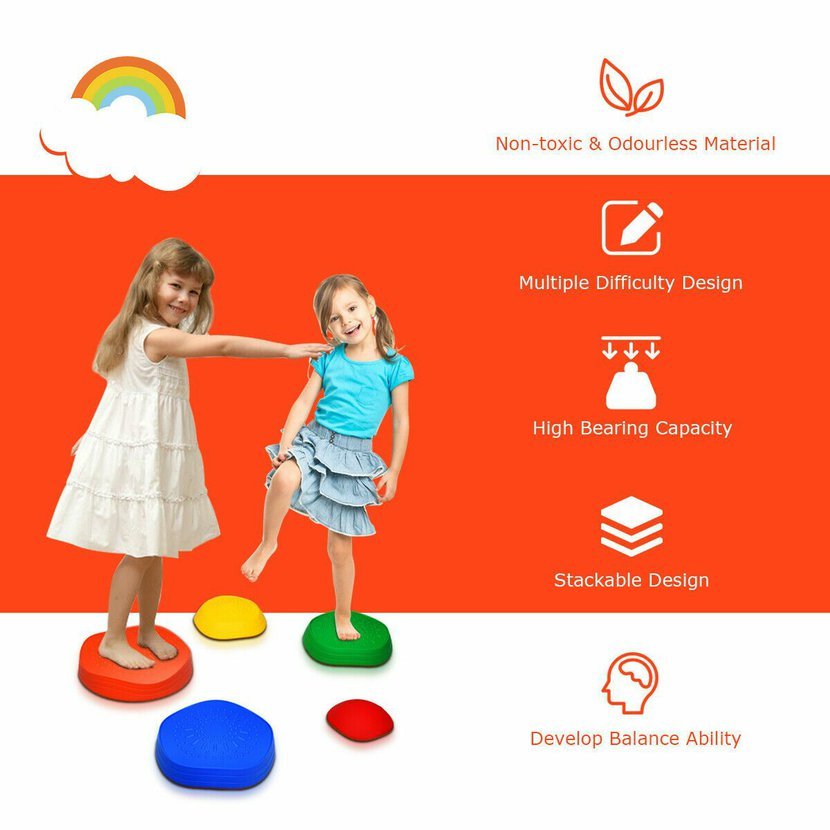Barevný set různých velikostí a výšek podporuje kreativitu a láká děti k pohybu. Balanční kameny jsou perfektní volbou pro domácí použití i venkovní hry – ideální pomůcka pro zábavné učení rovnováhy, koordinace a stability formou hry.