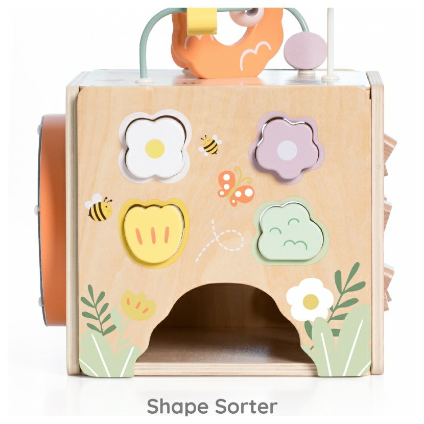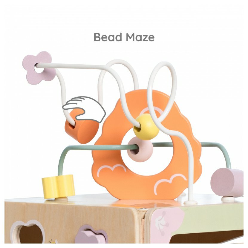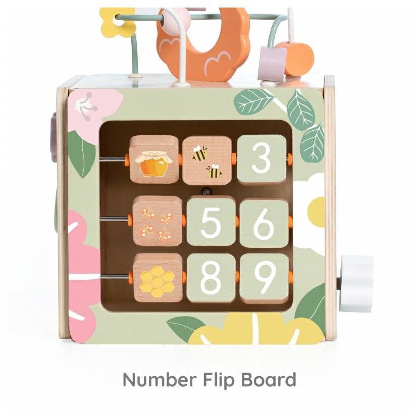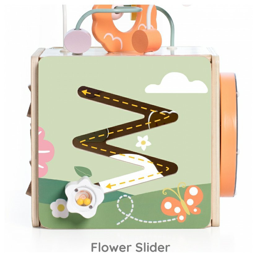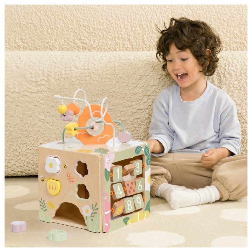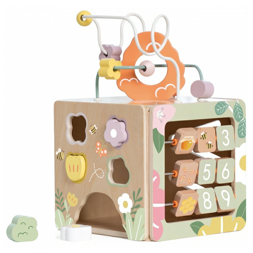 Tato smyslová a vzdělávací kostka nabízí hned pět různých aktivit v jednom provedení, které podporují rozvoj jemné motoriky, logického myšlení, rozpoznávání tvarů, barev a koordinaci ruky a oka. Každá strana kostky skrývá jiný herní prvek – dítě může posouvat korálky v labyrintu, otáčet barevné kostičky s čísly a obrázky, vkládat tvary do otvorů, objevovat pohyblivé části nebo rozvíjet zrakové vnímání prostřednictvím senzorických prvků.