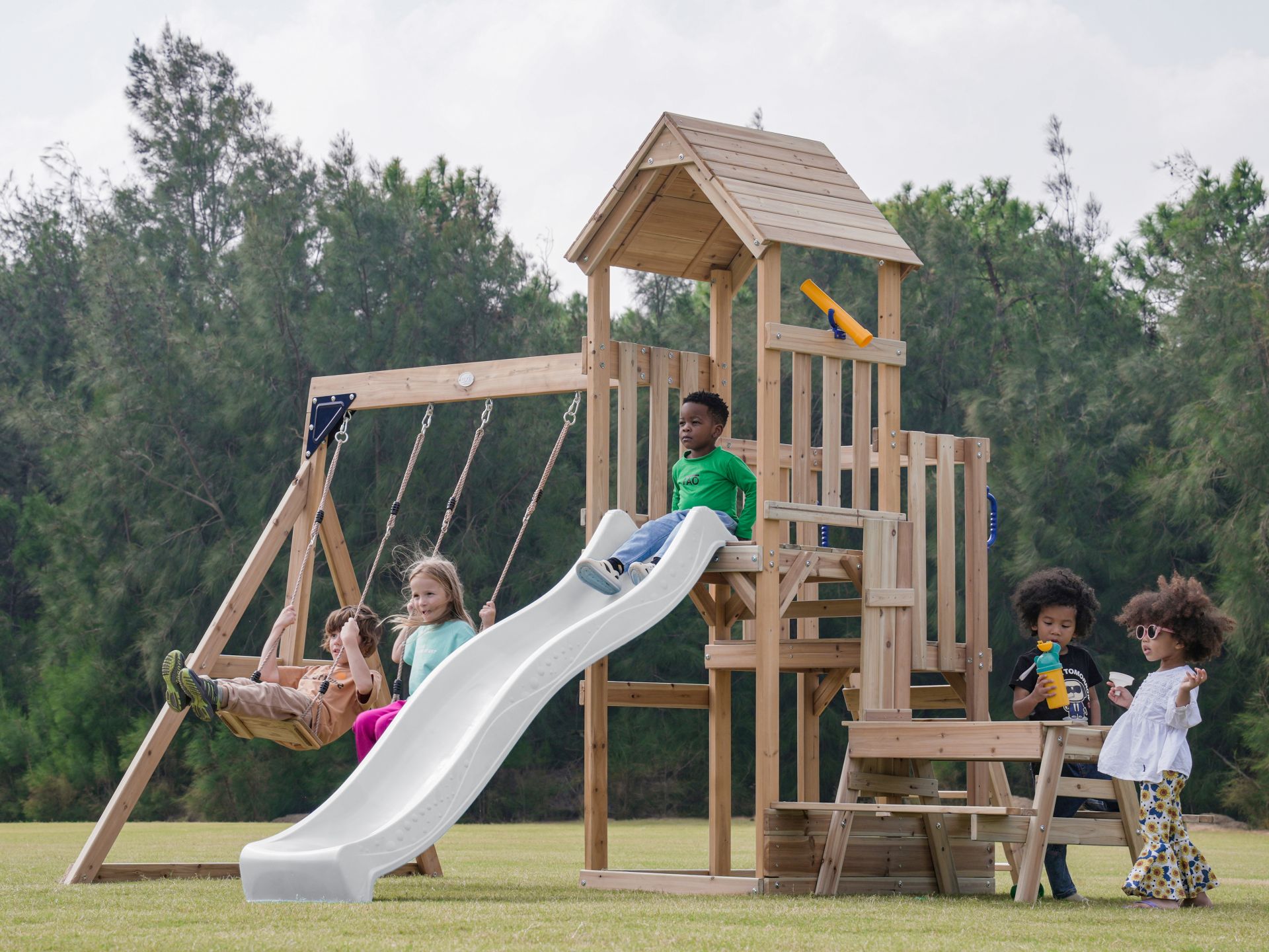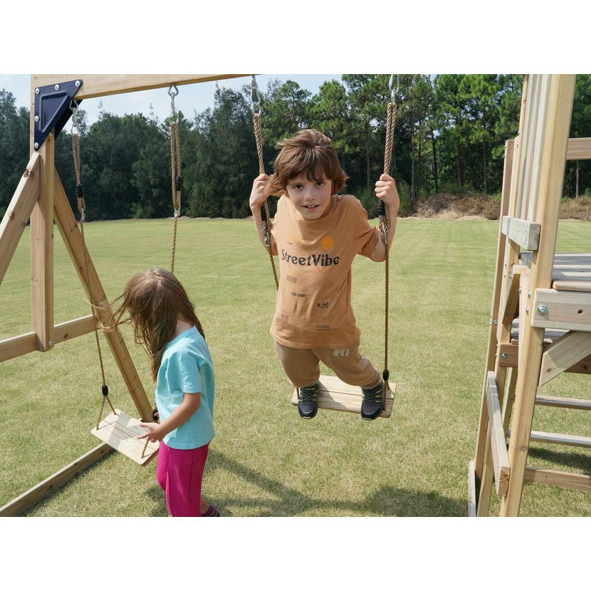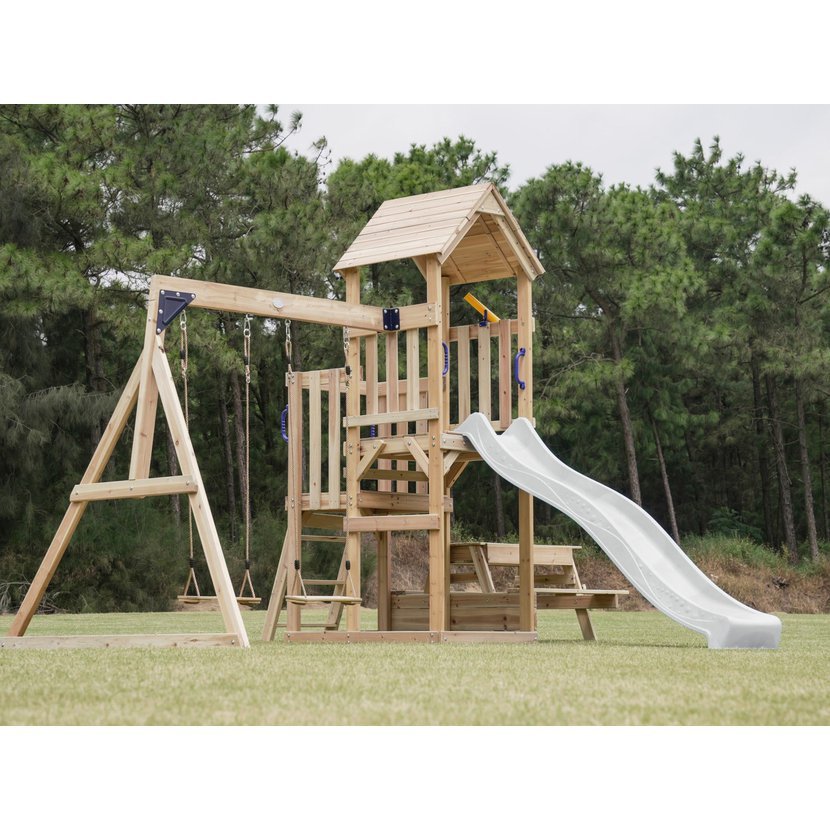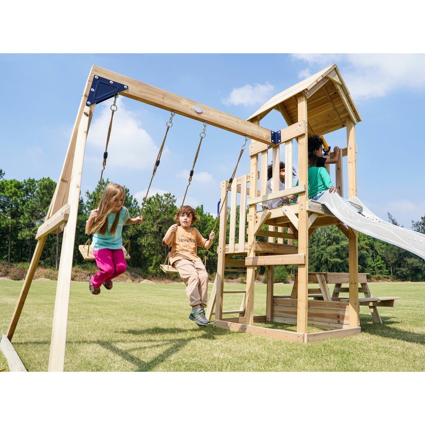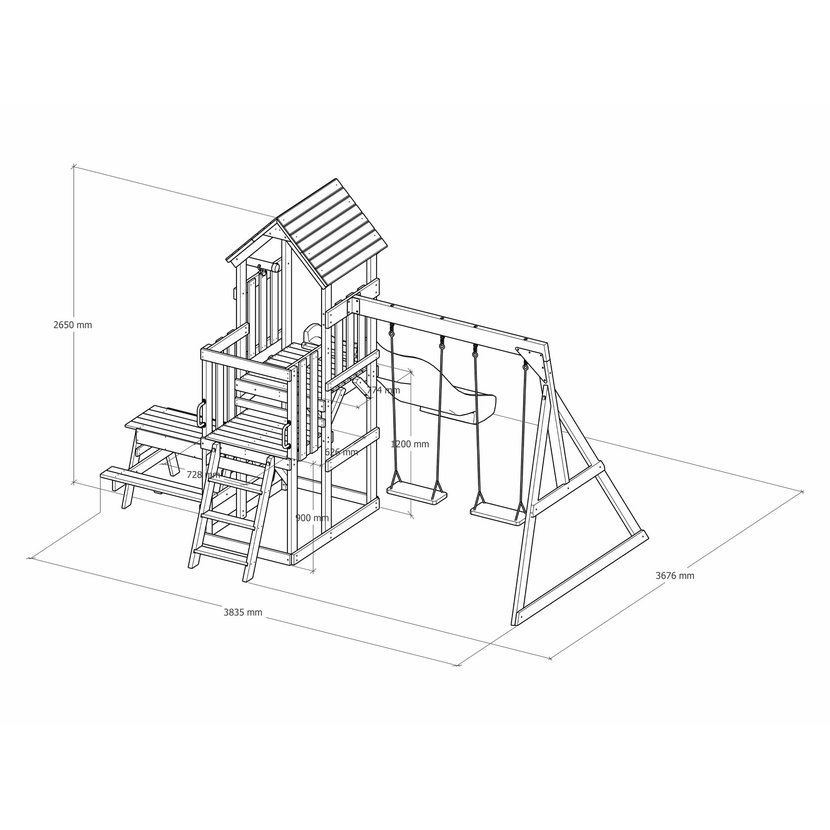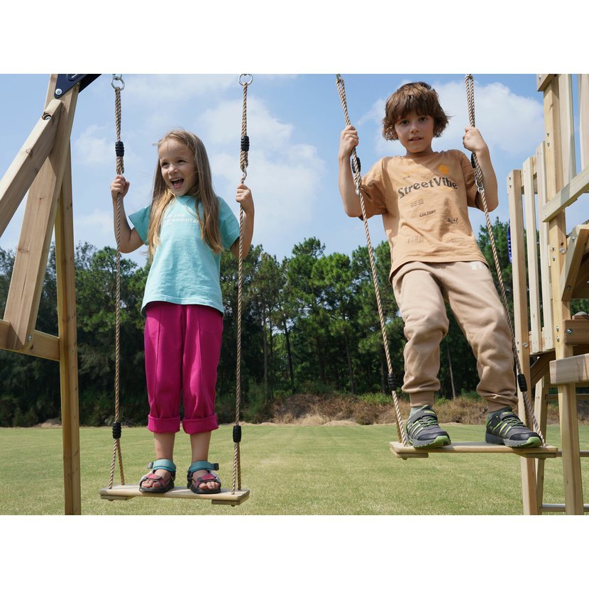 Součástí herní věže je rozšířující houpačkový modul, na kterém je umístěna závěsná hrazda Monkey Bar a dvě dřevěné houpačky. Všechny plastové části jsou z celoprobarveného, stálobarevného, UV odolného plastu pro celoroční užítí venku. Zemní kotvy jsou také součástí dodávky, aby sestava byla v terénu bezpečně uchycena.