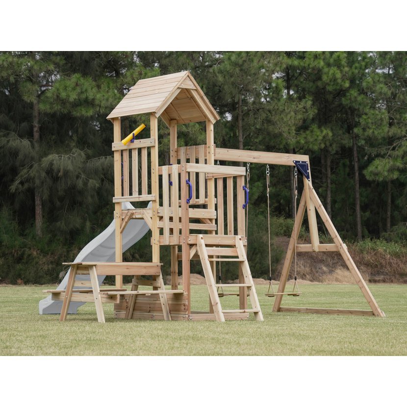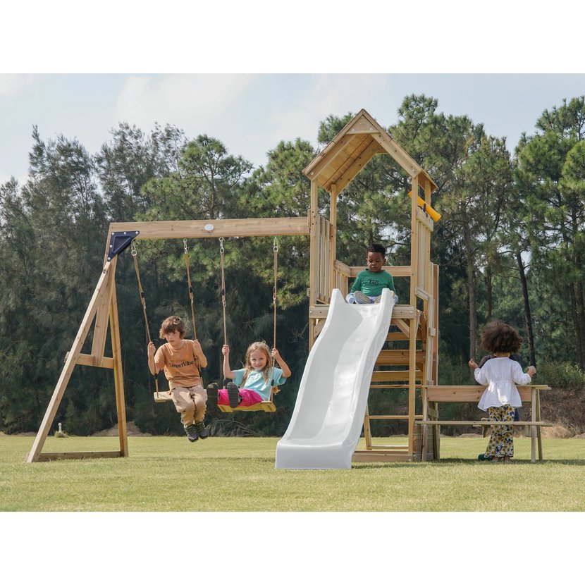Dokonalé multifunkční dětské hřiště, které má všechno!! Dvoupodlažní herní sestava se skluzavkou o délce 220 cm, je dále rozšířená o masivní houpačkový modul se dvěmi kusy závěsných houpaček a piknik modulem pod podestou. Děti budou mít báječný výhled do okolí z luxusní herní věže, která je částečně zastřešena dřevěnou střechou. Z podesty ve výšce 90 cm je připojený dřevěný lezecí žebřík.