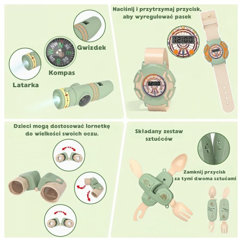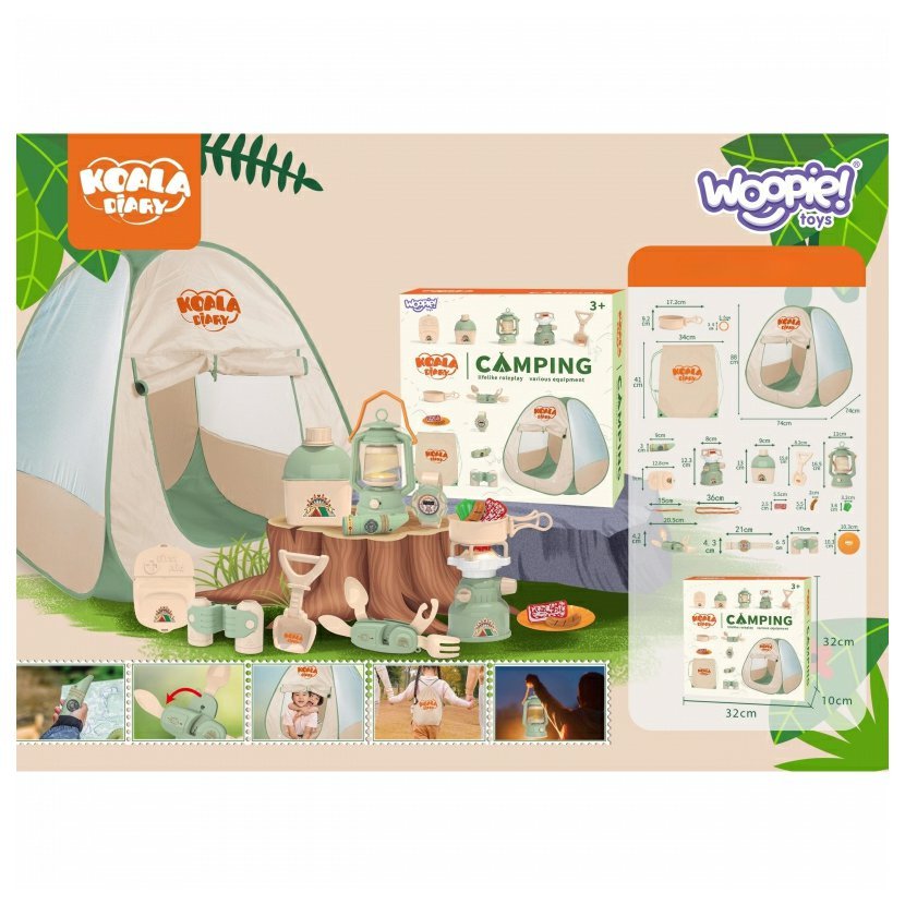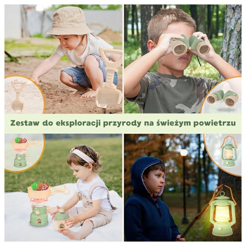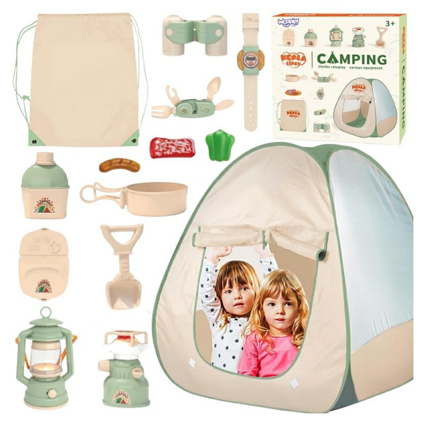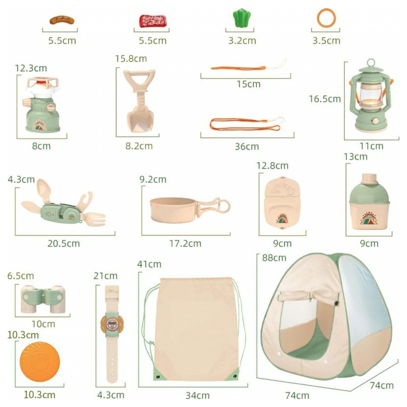 Skládací stan XXL (přibližně 74 × 74 × 88 cm) Praktický batoh pro přenášení sady Plynový vařič (hračka) Lampička a baterka Dalekohled a kompas Talířky a příbory „Dobroty“ na vaření (hračka) Malý nůž a saperka (hračka)