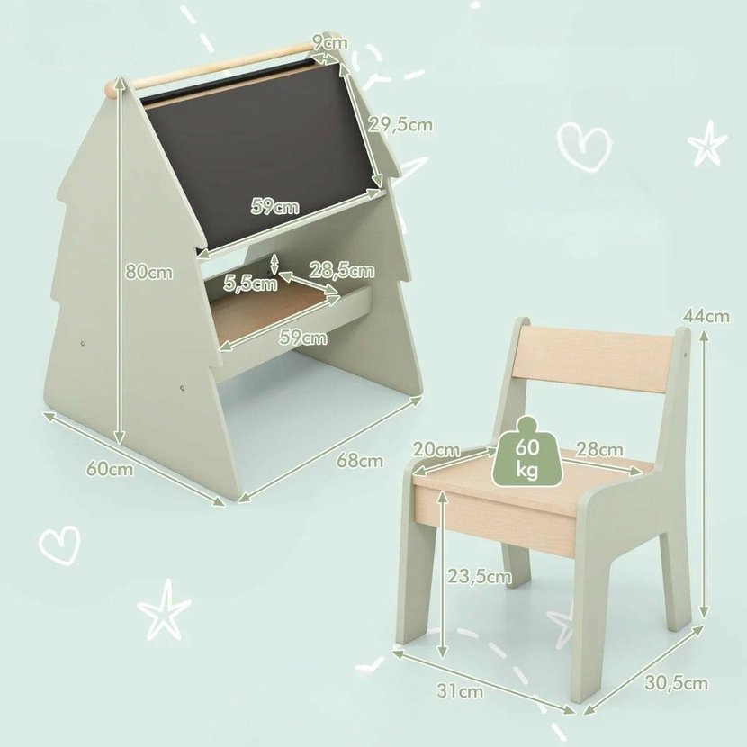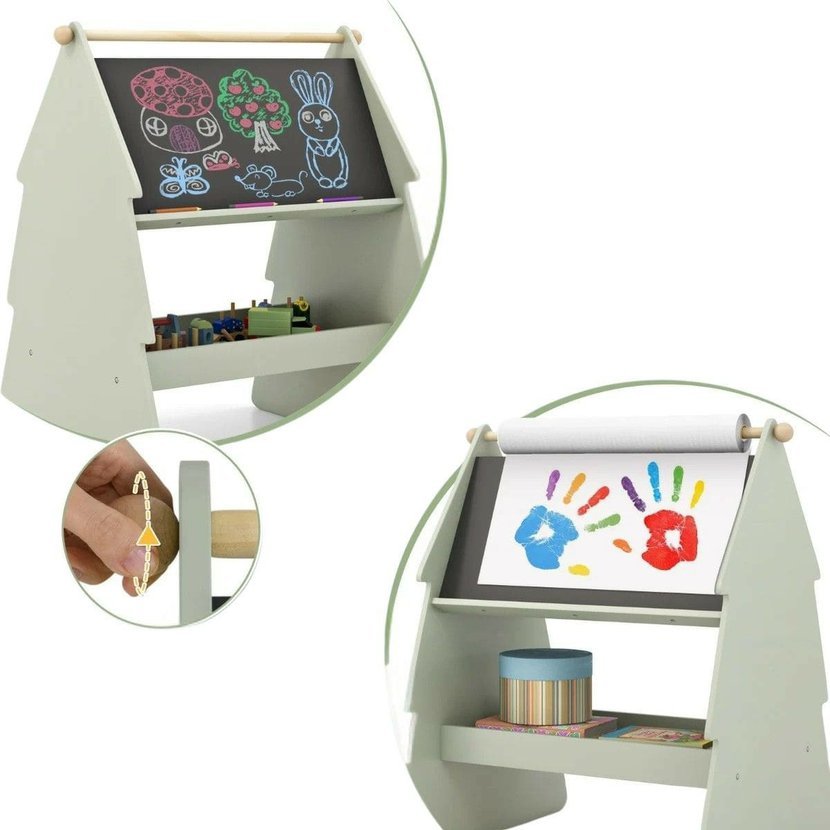 S touto oboustrannou tabulí a rolí papíru na kreslení mohou děti malovat své oblíbené obrázky se svými kamarády, každý z jedné strany nebo jednoduše procvičovat kreslení, malování, psaní a hláskování. V horní části je dřevěná kulatá tyč pro umístění roli papíru k malování. K jeho praktičnosti přispívá i to, že tento stojan obsahuje prostornou uložnou přihrádku, která udržuje malířské a kreslící nástroje přehledně uspořádané a snadno přístupné. Pokud budou děti u kreslení trávit hodně času, mohou si odpočinout a sednout na stoličku, která je součástí sady. Ve spodní části stojanu mohou děti odkádat své oblíbené knižní příběhy nebo pracovní sešity.