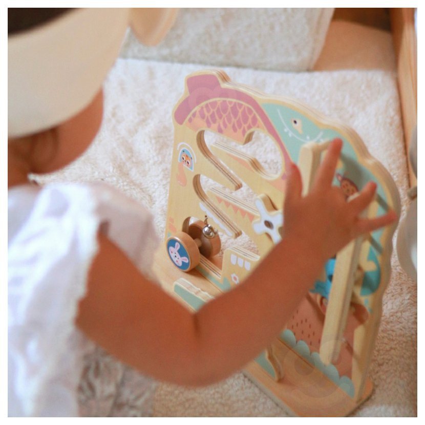 Dobrodružství začíná s touto dřevěnou tabulí 2v1, která kombinuje klasický labyrint a edukační tabuli.