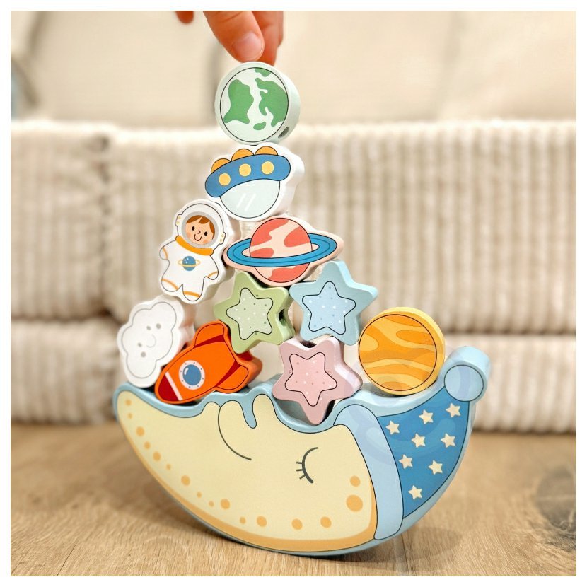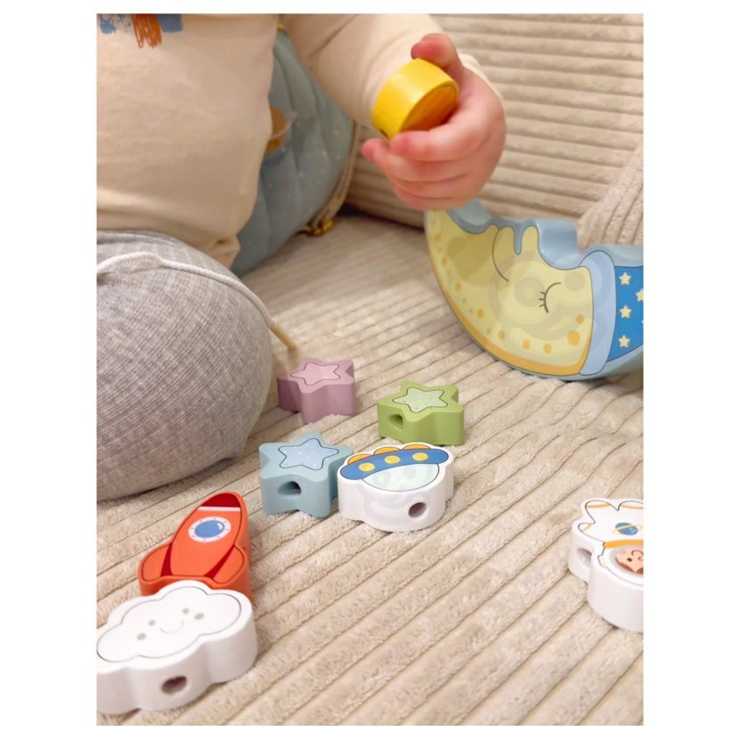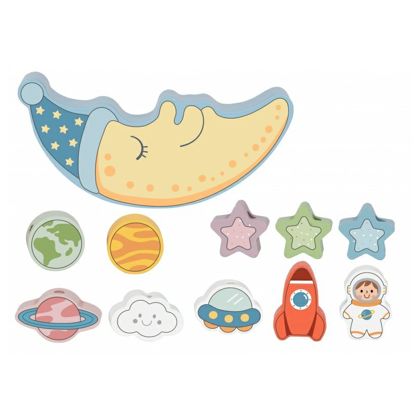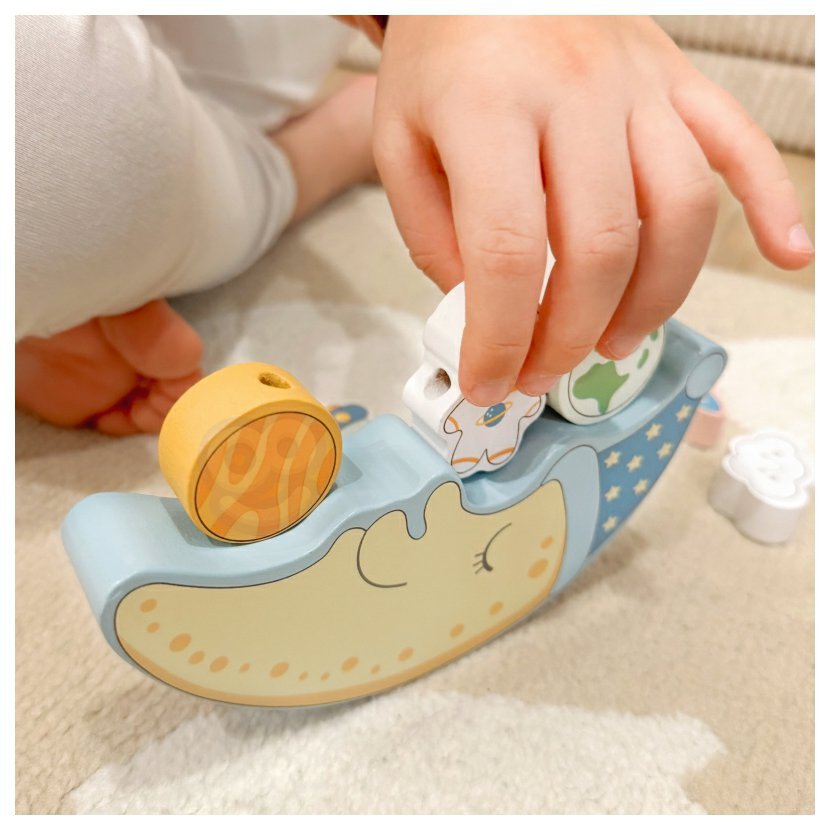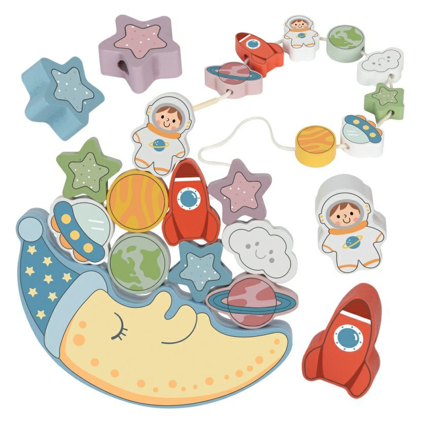 Probuďte představivost malého kosmonauta s montessori balanční sadou. První část spočívá v pečlivém skládání barevných dřevěných destiček — kupříkladu rakety, astronauta, planety, hvězdiček, obláčku — na obličej měsíce tak, aby zůstala stabilní a nedošlo k převrácení. Je to skvělý trénink trpělivosti, preciznosti a smyslu pro rovnováhu. Druhá část přináší možnost navlékání těchto barevných dílků pomocí dřevěné jehly a šňůrky, čímž se rozvíjejí jemné motorické dovednosti, koordinace ruka-oko a kreativita.