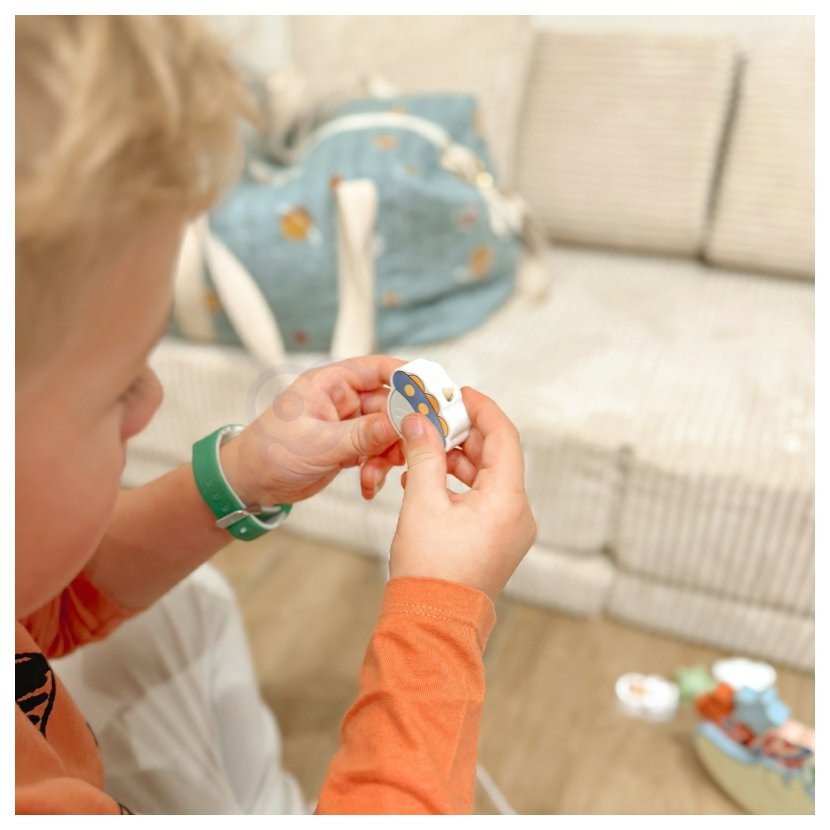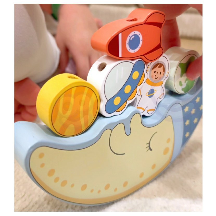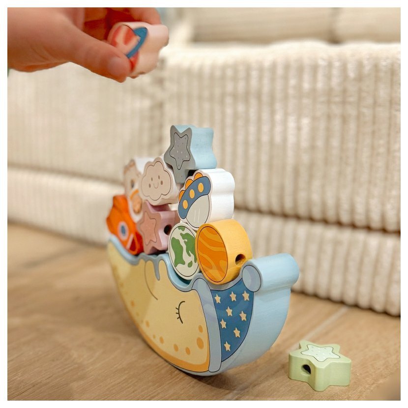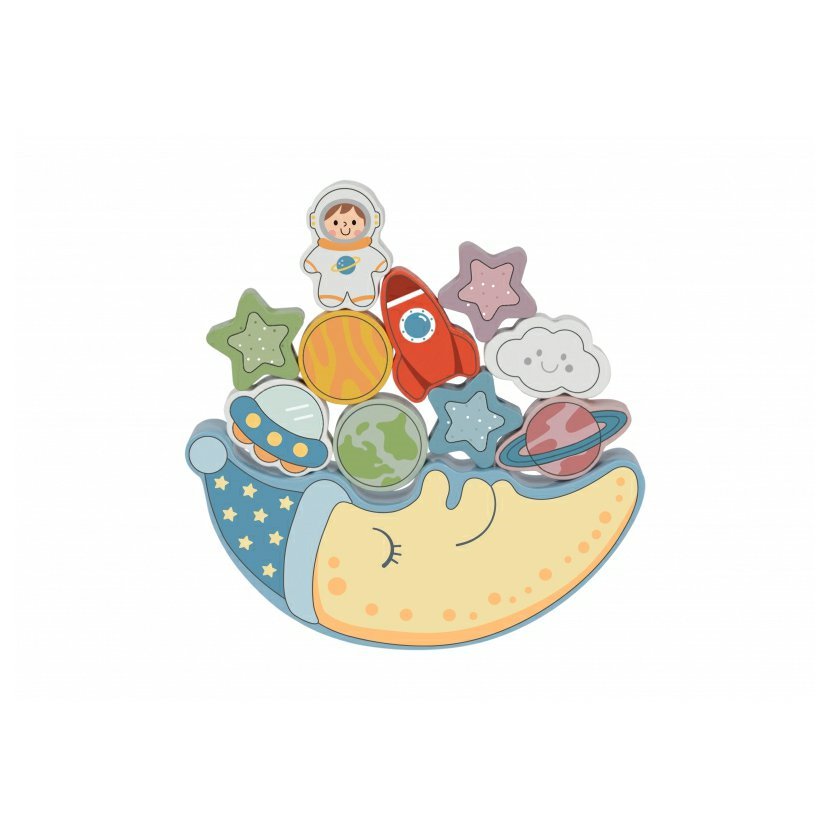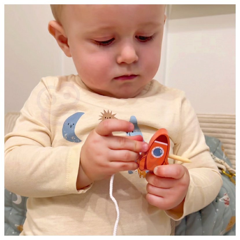 Probuďte představivost malého kosmonauta s montessori balanční sadou. První část spočívá v pečlivém skládání barevných dřevěných destiček — kupříkladu rakety, astronauta, planety, hvězdiček, obláčku — na obličej měsíce tak, aby zůstala stabilní a nedošlo k převrácení. Je to skvělý trénink trpělivosti, preciznosti a smyslu pro rovnováhu. Druhá část přináší možnost navlékání těchto barevných dílků pomocí dřevěné jehly a šňůrky, čímž se rozvíjejí jemné motorické dovednosti, koordinace ruka-oko a kreativita.