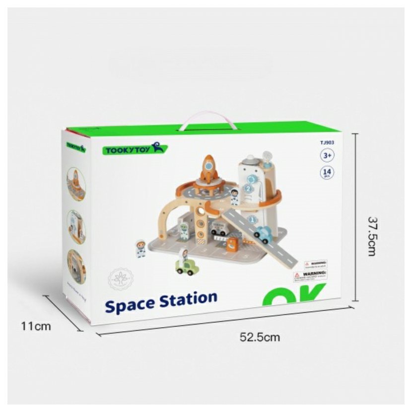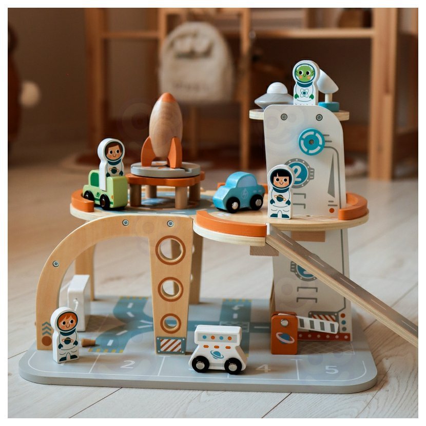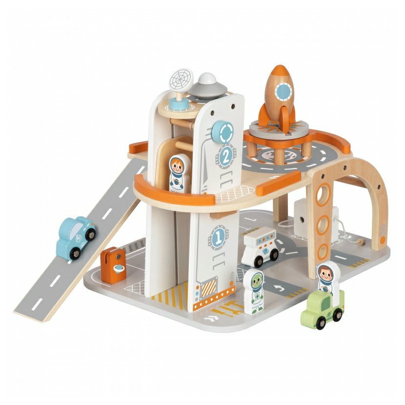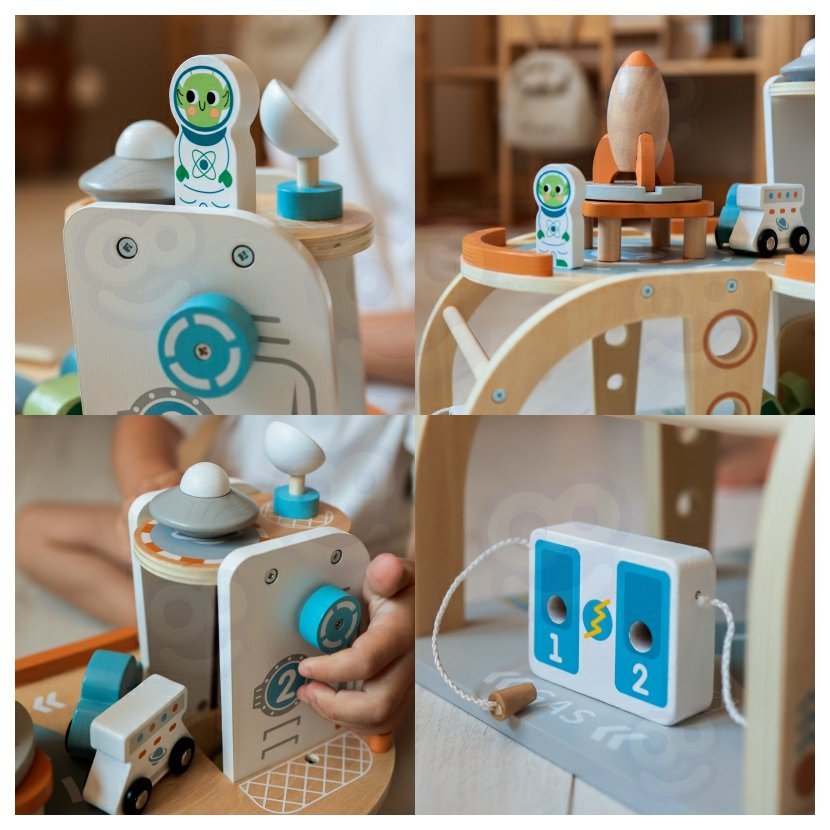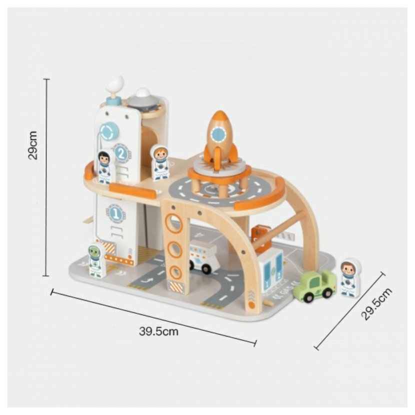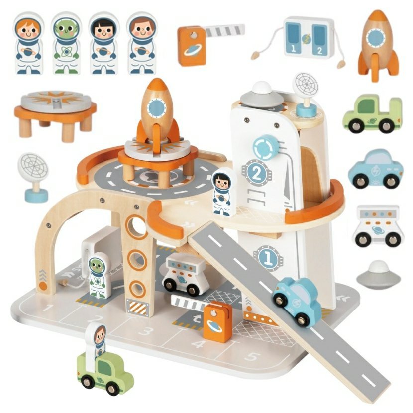 Dřevěná kosmická parkovací stanice - je vícepatrová vesmírná stanice s rampami, výtahem a bohatým příslušenstvím, jako jsou raketa, kosmická vozidla, UFO, satelit a figurky astronautů.