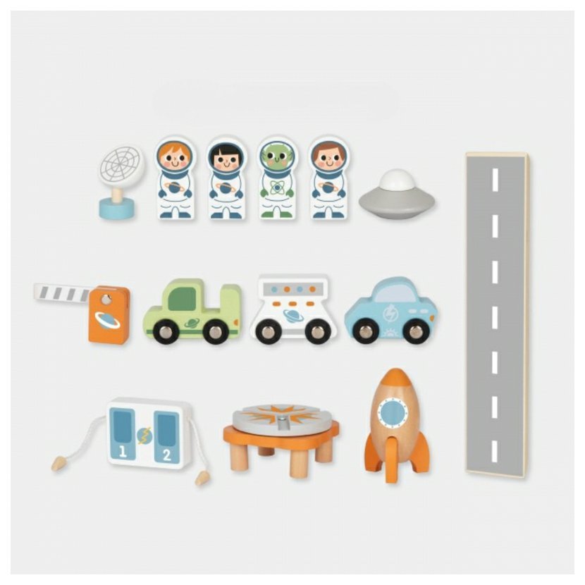 Součástí sady je bohaté příslušenství – raketa, kosmická auta, UFO, satelit, radar, figurky astronautů i roztomilého mimozemšťana a také brána se závorou či nabíjecí stanice. Děti tak mohou hrát různé scénáře, od objevování planet až po řízení vesmírné dopravy.