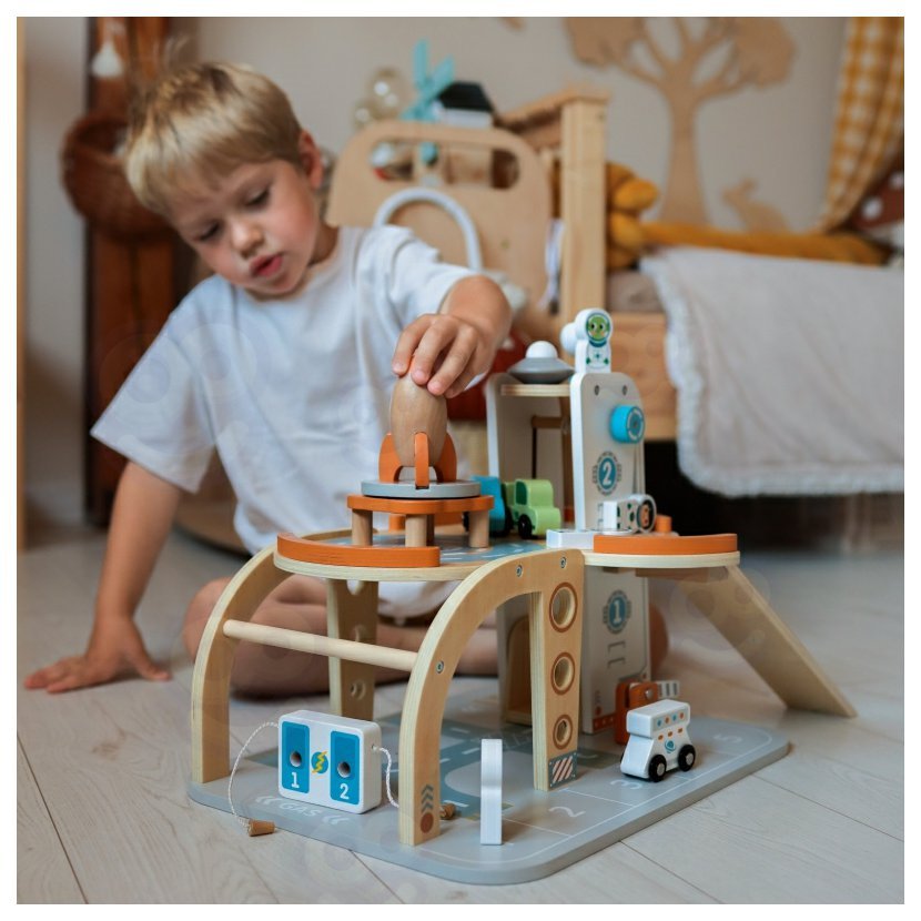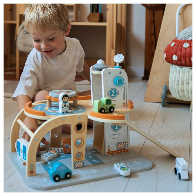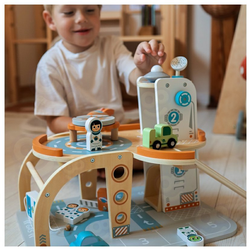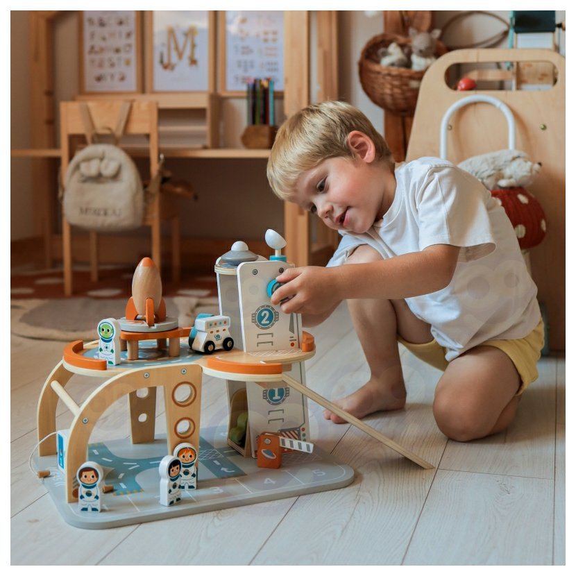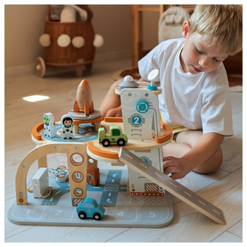 Dřevěná kosmická parkovací stanice - promění dětský pokoj v jedinečnou vesmírnou základnu, kde mohou malí objevitelé přistávat, startovat i parkovat svá kosmická vozidla. Vícepodlažní konstrukce s rampami, výtahem a přistávací plochou nabízí mnoho prostoru pro kreativní hru a vytváření vlastních galaktických příběhů.