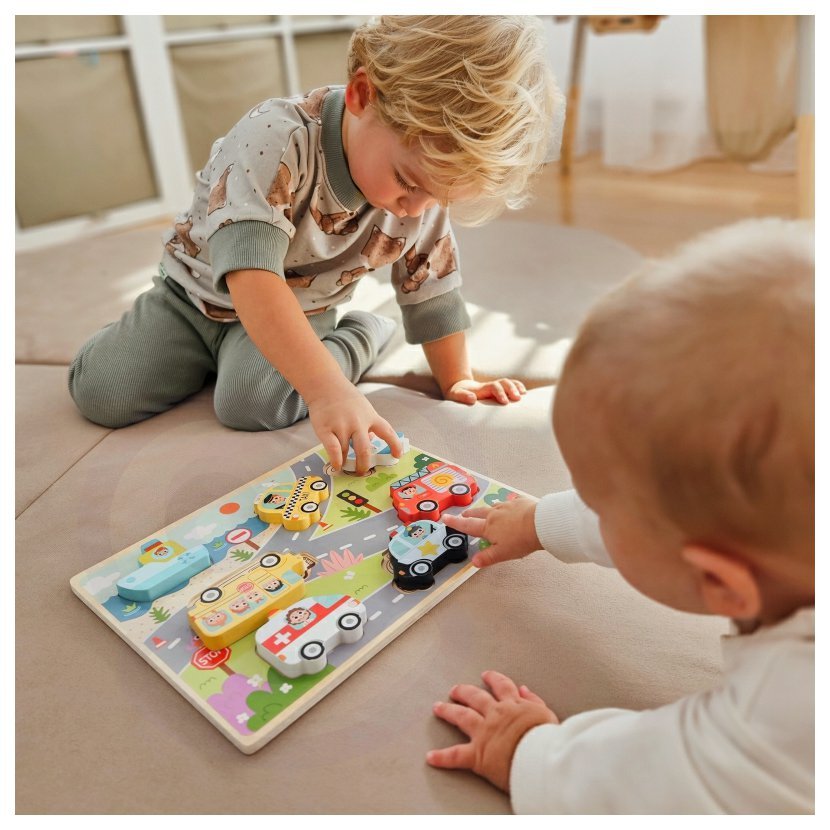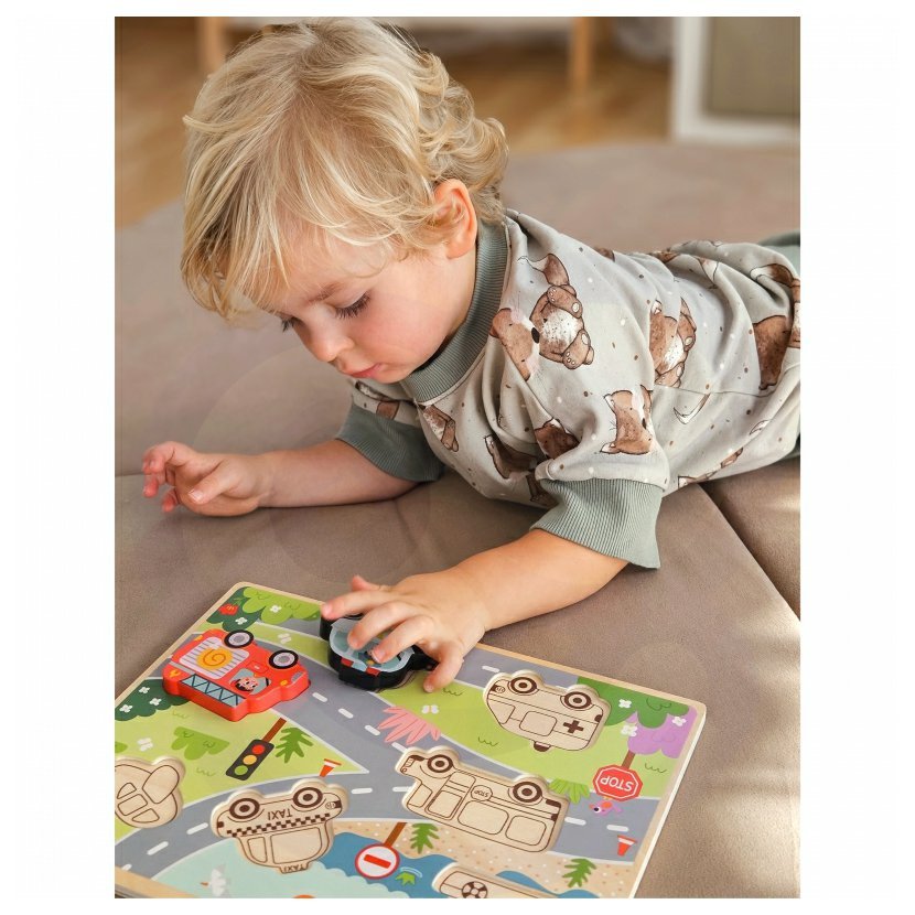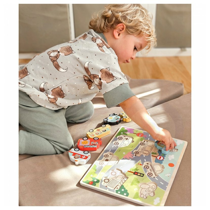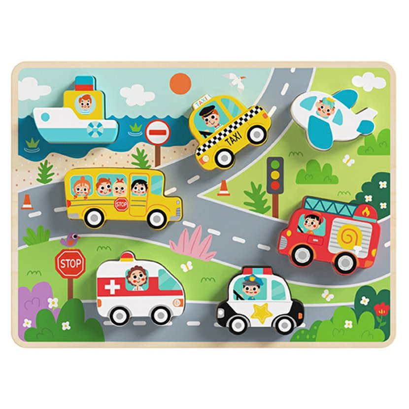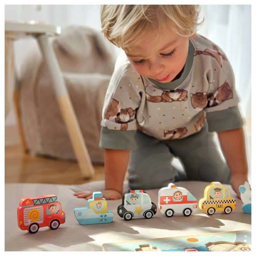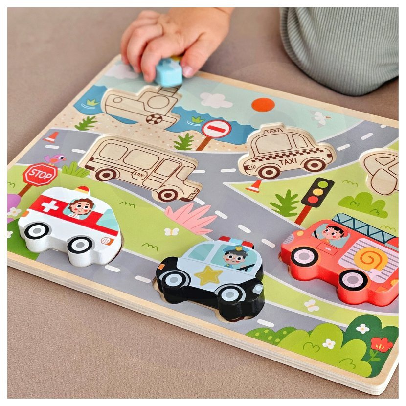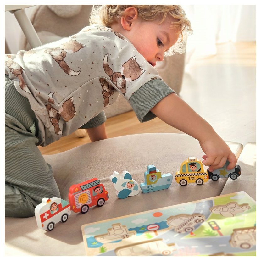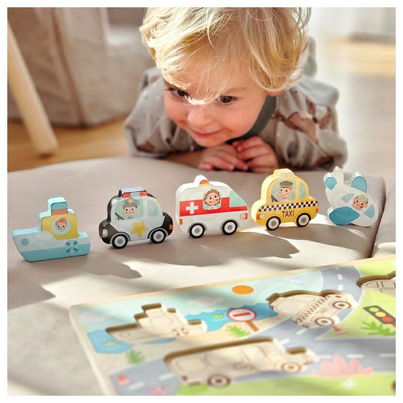 Objevuj svět dopravy s dřevěnými puzzle! Barevné tvary aut, letadel a lodí čekají, až je malý objevitel správně umístí na jejich místo. Hračka rozvíjí logiku, motoriku i trpělivost – a navíc přináší radost z každého dokončeného obrázku. Ideální první puzzle pro malé ručičky!