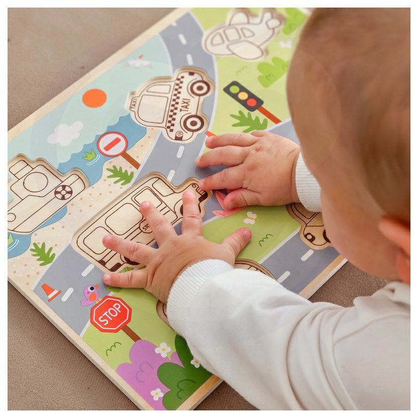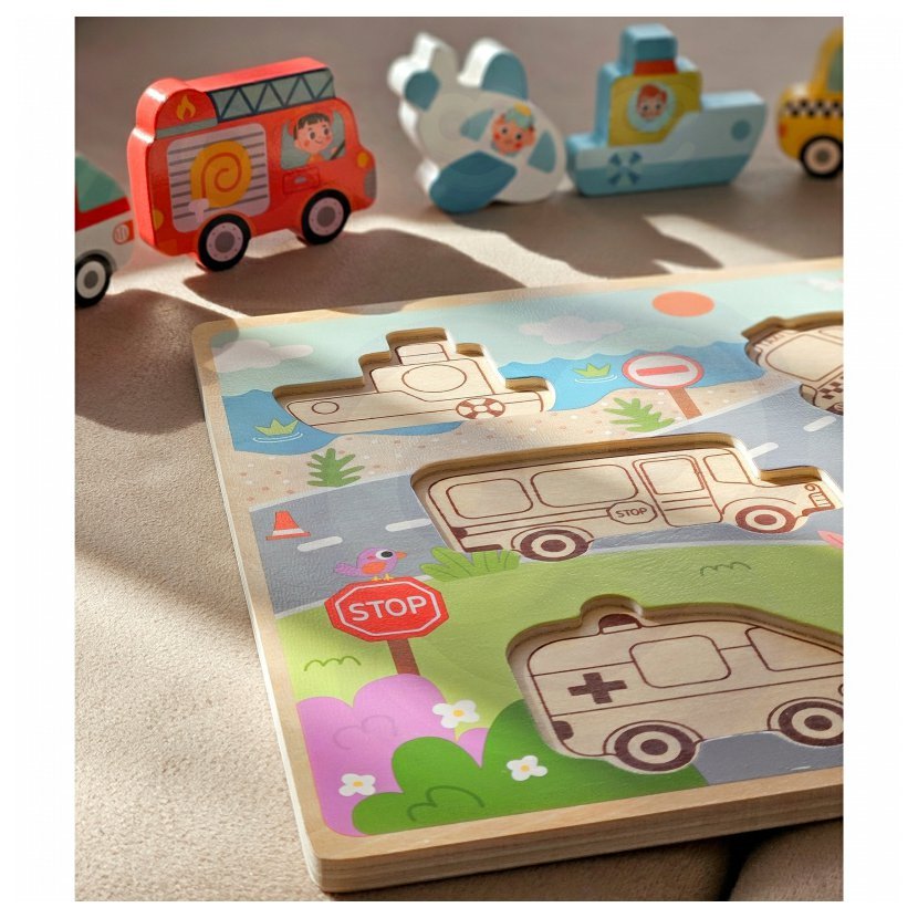 Dřevěné puzzle jsou určené dětem od 12 měsíců a spojují hraní s učením. Set obsahuje destičku s vyřezanými otvory ve tvarech různých dopravních prostředků, jako jsou auta, letadla a lodičky, a sedm barevných dílků, které dítě vloží na správné místo.
