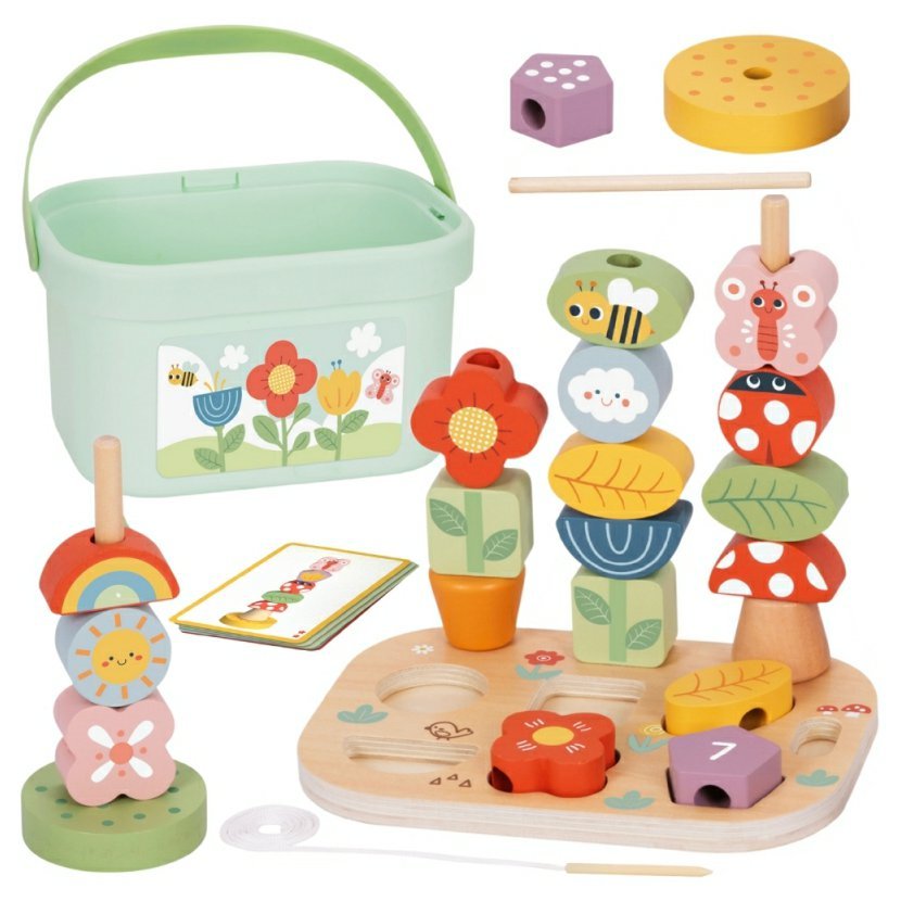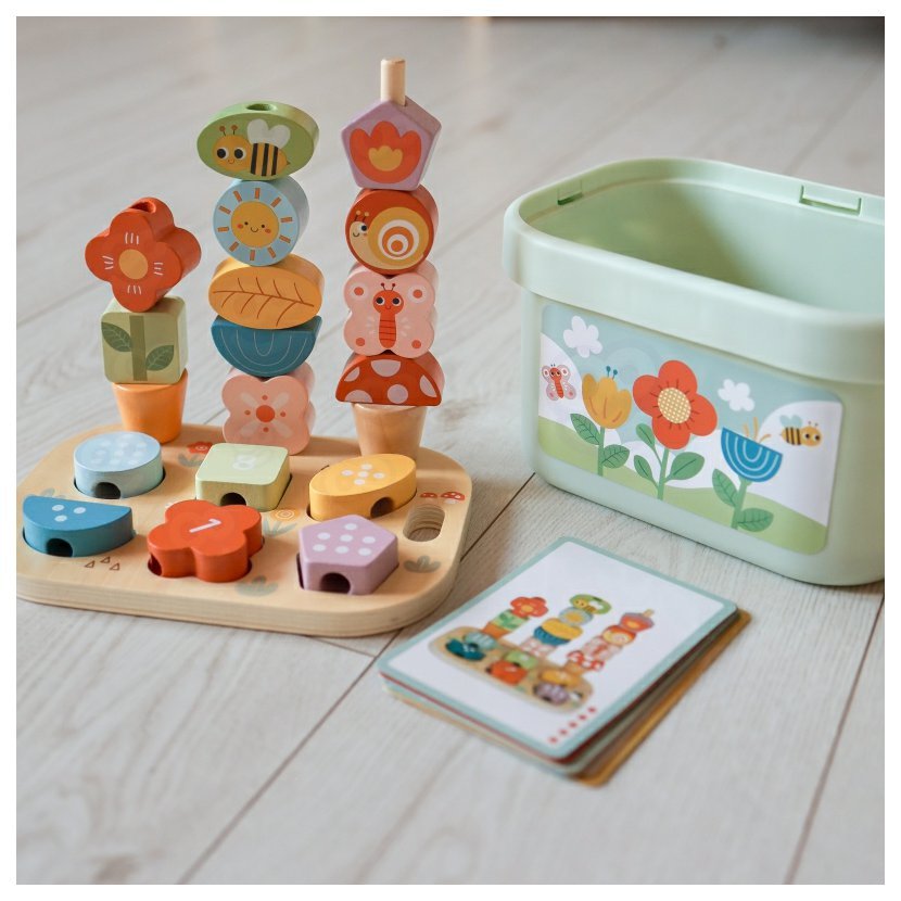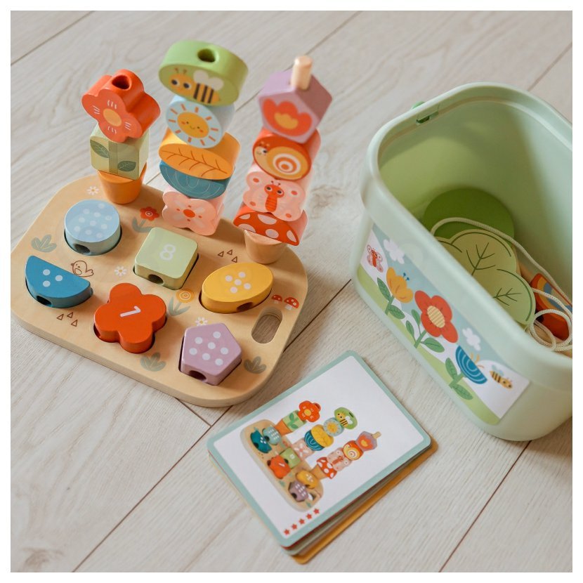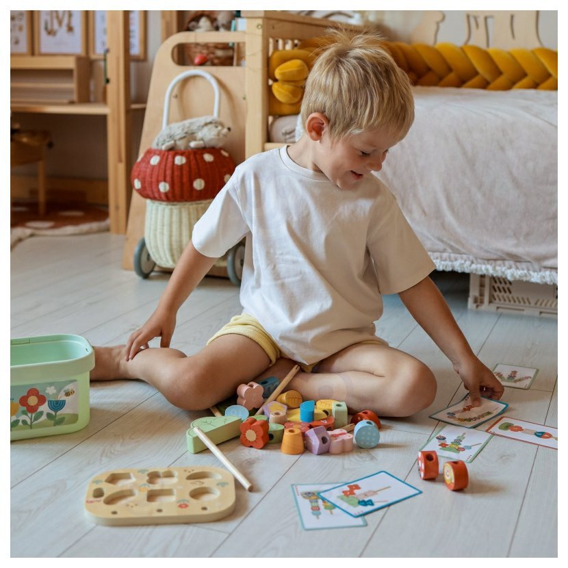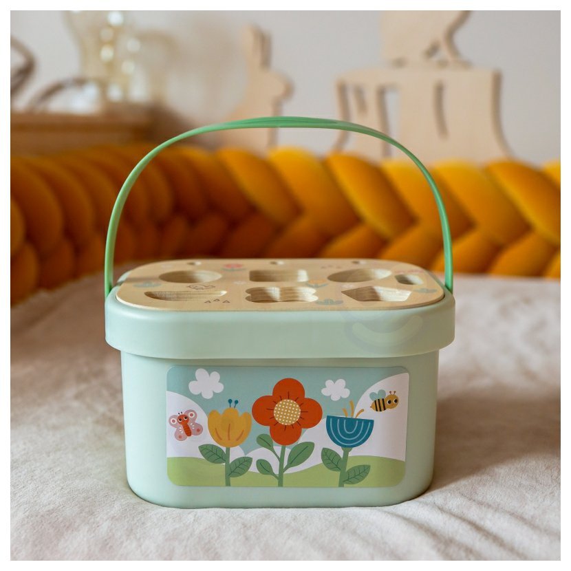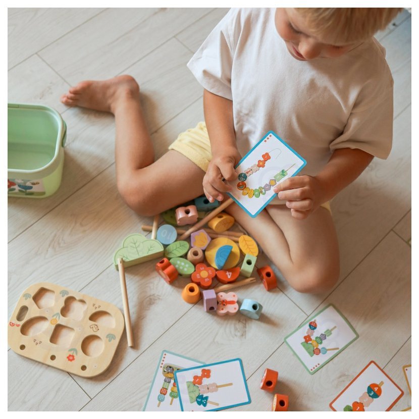 Box je vyroben z kvalitního dřeva a natřen netoxickými, bezpečnými barvami. Má rozměry přibližně 21,8 × 15,4 × 12 cm. Uvnitř se skrývá několik herních aktivit – navlékání korálků pro rozvoj jemné motoriky, třídění tvarů a barev pro trénink logického myšlení, stavění podle vzorů pro rozvoj prostorové představivosti a další úkoly podporující pozornost i tvořivost.