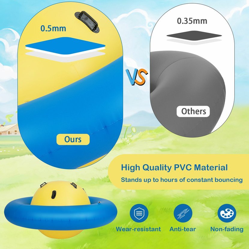 Nafukovací skákací míč je vyroben z PVC materiálu o tloušťce 0,5 mm a jeho použití je bezpečné a odolné, aby poskytoval roky zábavy.