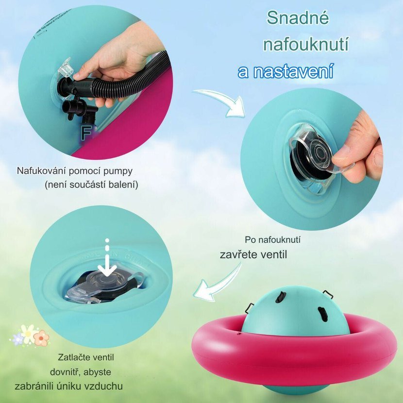 Nafukovací skákací míč se skládá ze dvou samostatných komor se samostatnými ventily, které snadno nafouknete pomocí pumpičky (NENÍ součástí balení).