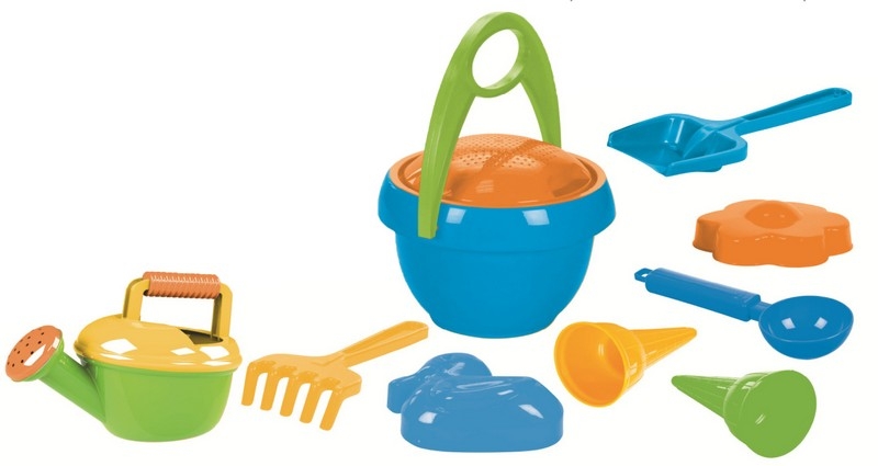 Kyblík (průměr 18cm), lopatka, hrabičky, 2 formičky, sítko, konvice na vodu, naběračka a 2 kornouty.