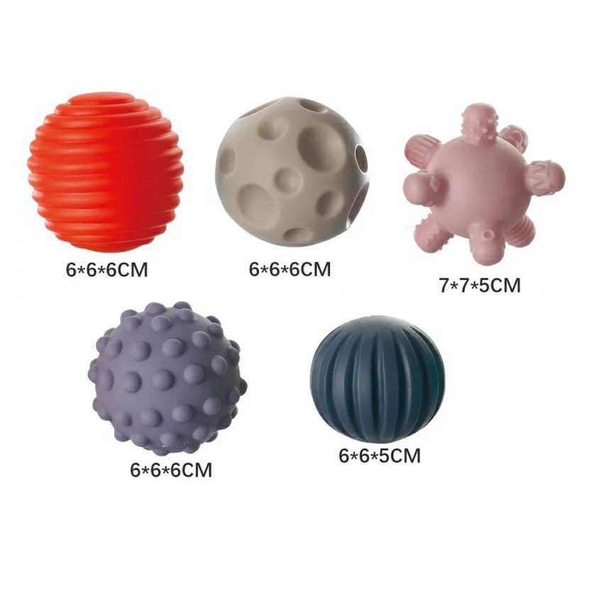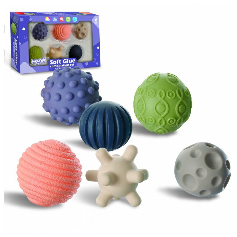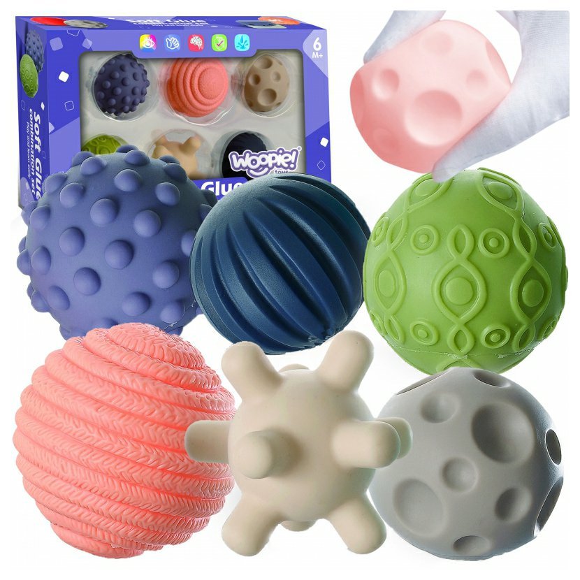 Sada obsahuje 6 měkkých kuliček, které jsou ideální hračkou pro nejmenší. Každá kulička má jinou texturu, barvu a tvar, vydává zvuk při stisknutí a pomáhá rozvíjet hmat, sluch i zrak.